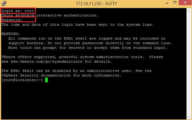 با وارد نمودن Username و Password وارد محیط ESXI CLI می شویم. (به دلیل افزایش امنیت پسورد و تعداد کاراکتر های آن نمایش داده نمی شود.)