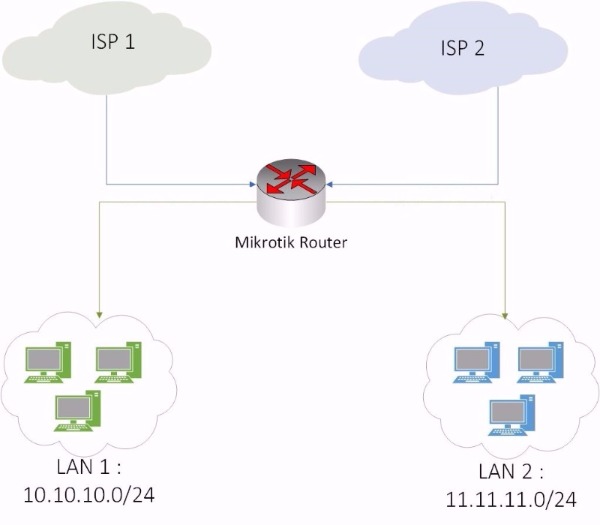همانطور که در تصویر می بیند در اینجا میخواهیم LAN 1 از ISP 1 و LAN 2 از ISP 2 استفاده کند.
