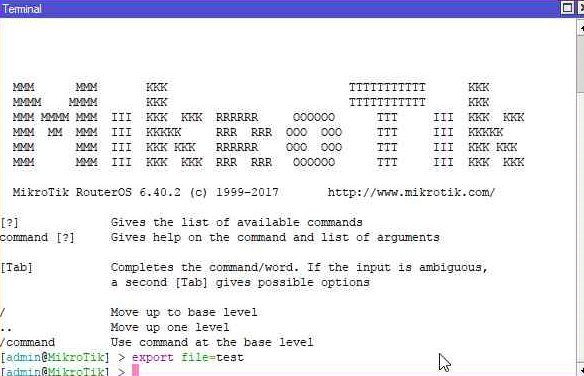 در روش Export back up وارد Terminal شده و کامند Export file=test را تایپ کرده و Enter میزنیم. به جای test هر اسم دیگری میتوان انتخاب کرد.